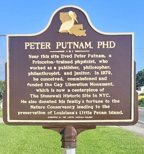 A Louisiana Historical Marker honoring physicist and philanthropist Peter Putnam was placed recently near 3127 East Main Street in Houma, Louisiana. In 1979, Putnam funded the Gay Liberation Monument, a sculpture by George Segal that is now a centerpiece of the Stonewall Historic Site in New York City. The marker was financed by attorney John J. Sullivan and sponsored by the LGBT+ Archives Project of Louisiana. Read more about Putnam here.