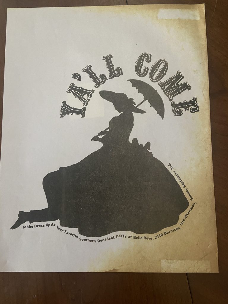 Pictured above is the very first Southern Decadence invitation. Did you know Southern Decadence started with a house party among friends in 1972? Since then, the has party evolved into an extravagant parade that attracts tens of thousands of revelers to the French Quarter every Labor Day weekend. From 1972 to 1980, co-founder Robert Laurent designed invitations to each celebration, all of which you can see here in our website’s Southern Decadence gallery.